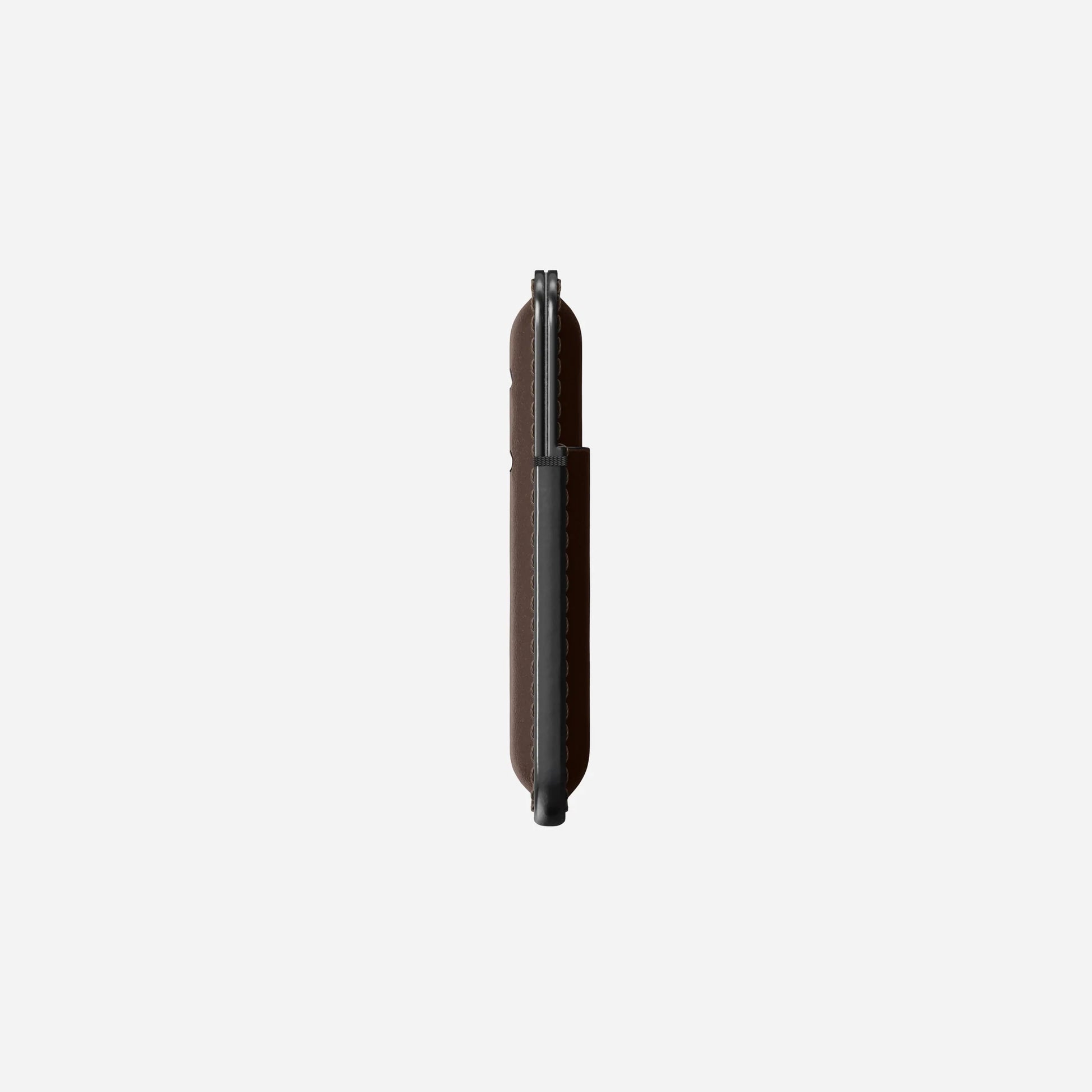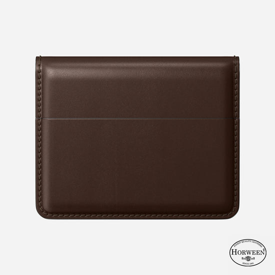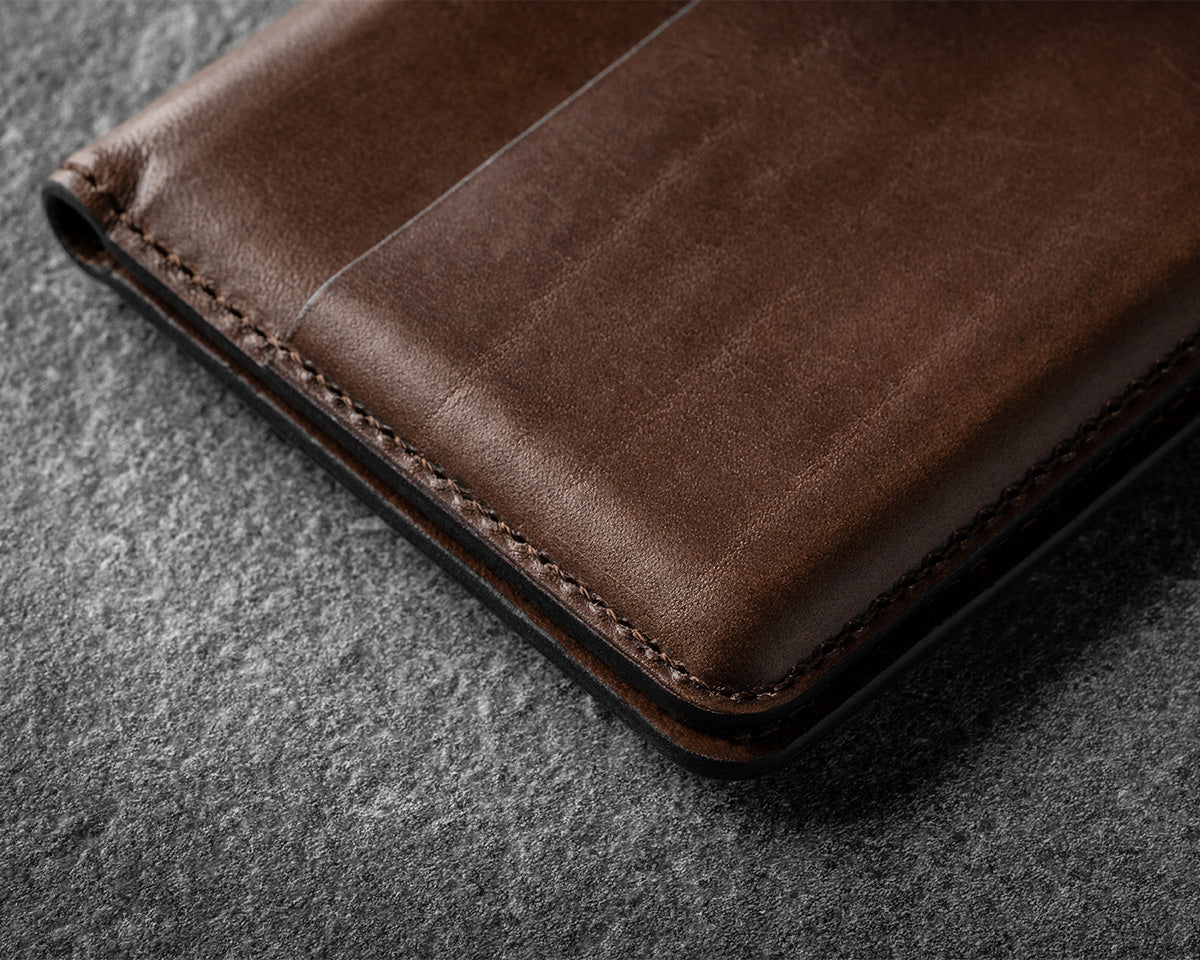 誇り高きHorweenレザーに、薄く強靭なファブリックを重ね合わせる。そして、熱と圧力という二重の力で、一気に形を刻み込む。この過程が、革の伸びを封じ、カードを逃さずホールドし、滑らかでしなやかな質感を永く保つ。