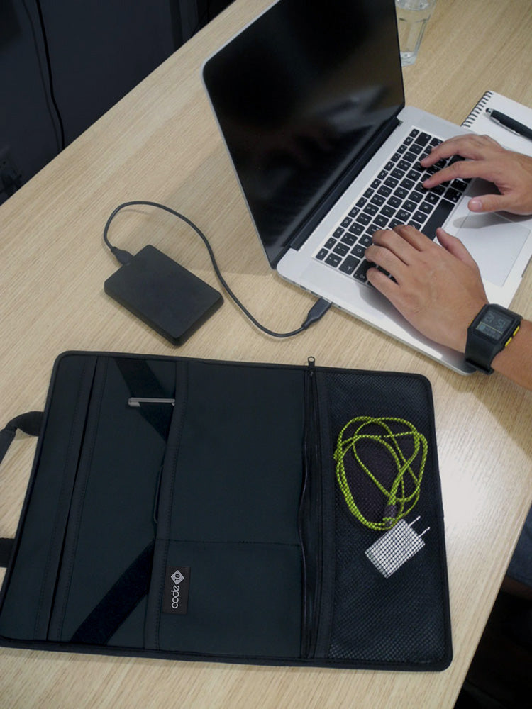 Code10バックパックには、取り外し可能な軽量テックスリーブが付属しています。スリーブはバッグ内部にしっかりと固定でき、テック機器を持ち歩かないときは取り外して使うことも可能です。最大15インチまでのノートパソコンに対応しており、スマートフォン、ハードディスク、モバイルバッテリー、ケーブル類なども収納できます。