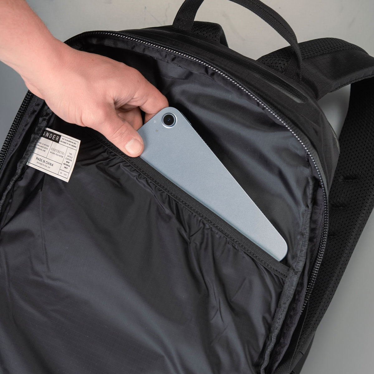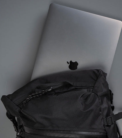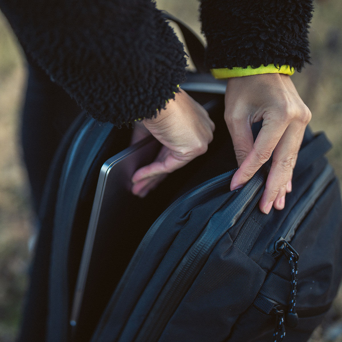 毎日の移動に欠かせないギアを、スマートに守るクッションスペース。素材には、TPUコーティングを施したリップストップ生地を使用。防水性・衝撃吸収性・通気性を兼ね備え、大切なテックアイテムをしっかりと保護する。さらに、内部には充電ケーブル用の“ホットルート”を搭載。使いながら整える、そんな日常がここにある。