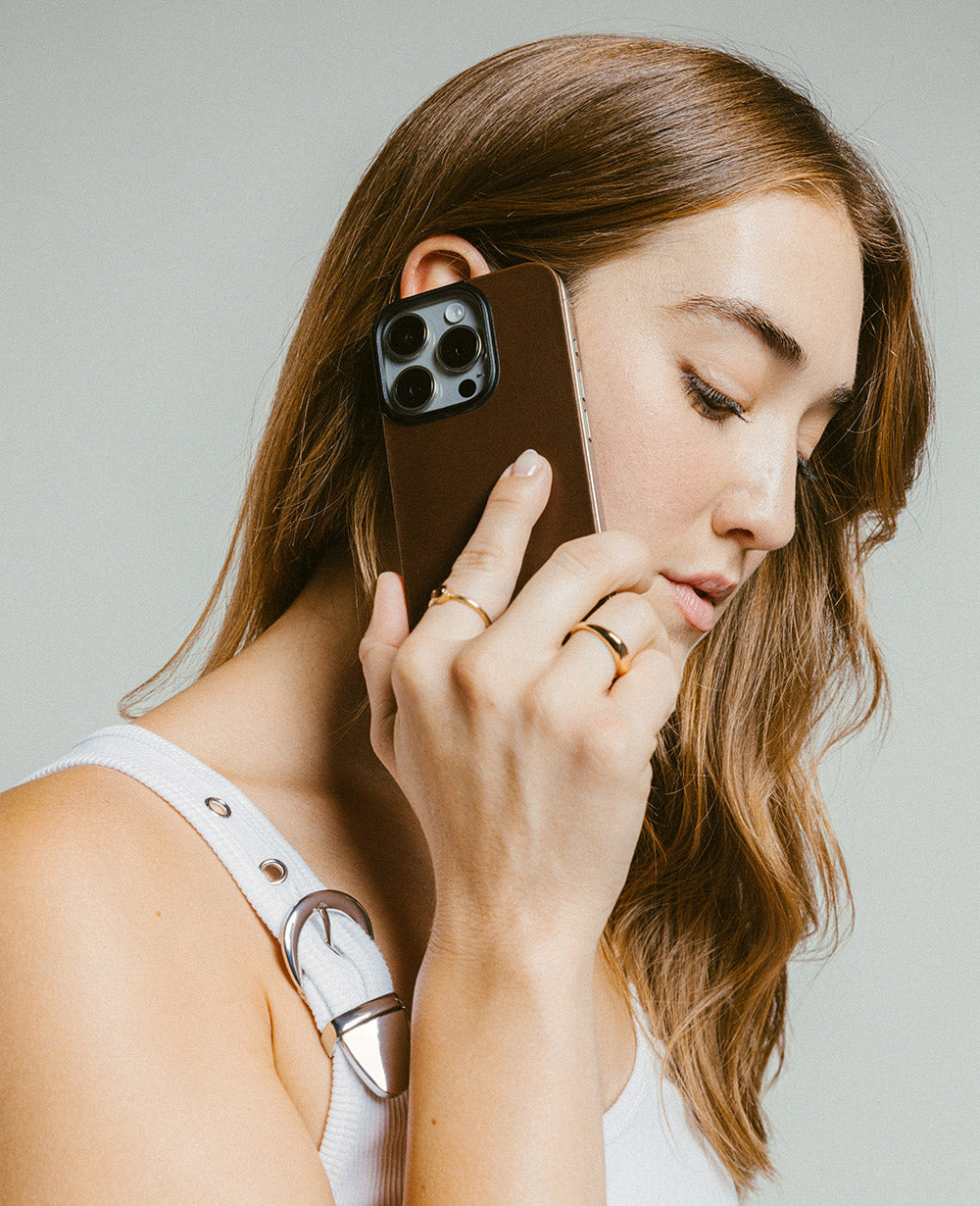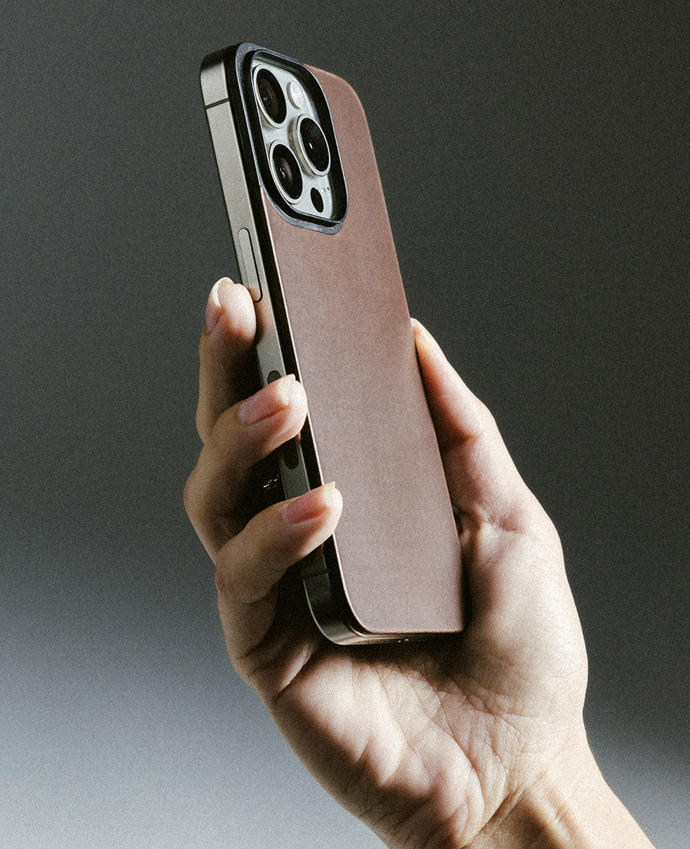 極限まで薄く、精密に仕立てられたMagnetic Leather Back。 iPhoneの美しい輪郭をそのままに、洗練と品格をまとうレザーの表情を添える。
