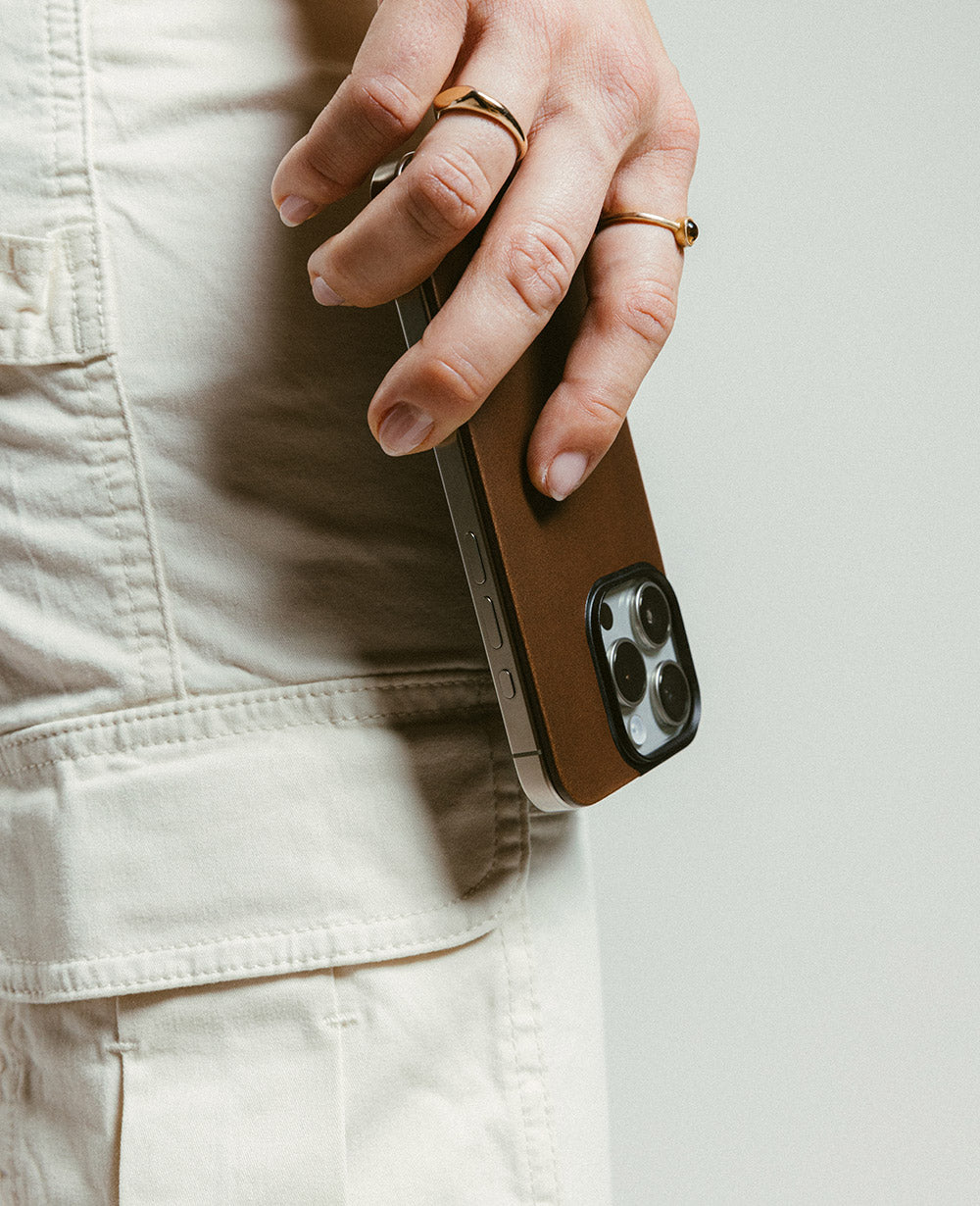 天然のワックスとオイルが染み込み、しっとりとした手触りと品格ある艶が魅力。細部までこだわり抜かれた仕上げが、iPhoneにかつてない高級感をもたらす。