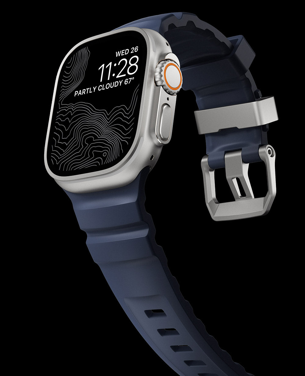 Rocky Point Bandは、Apple Watch Ultraのワイドなフレームにしっかりと対応し、チタン製ハードウェアが時計の仕上げと完璧に調和する。