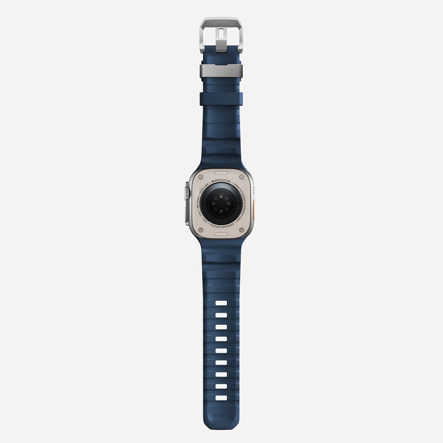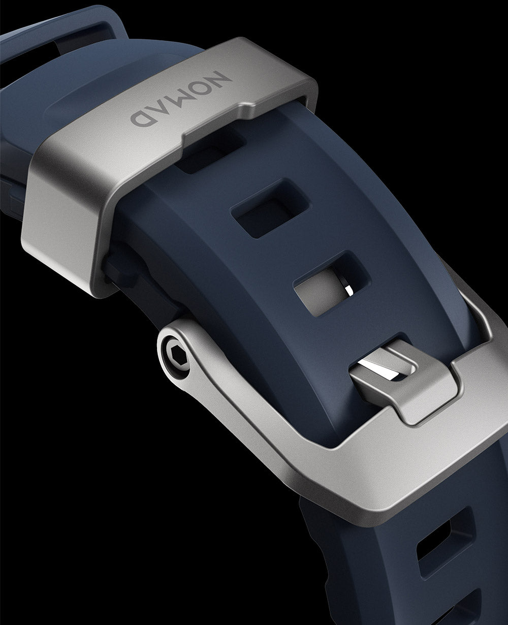 Rocky Point Bandのバックルとベルトループには、高品質チタニウムを採用。比類なき強度と軽さを誇る。NOMADの精密な加工技術が生み出す、究極の仕上がり。
