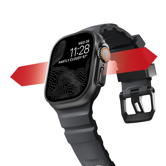 Rocky Point Bandは、Apple Watch Ultraのワイドなフレームにしっかりと対応し、チタン製ハードウェアが時計の仕上げと完璧に調和する。