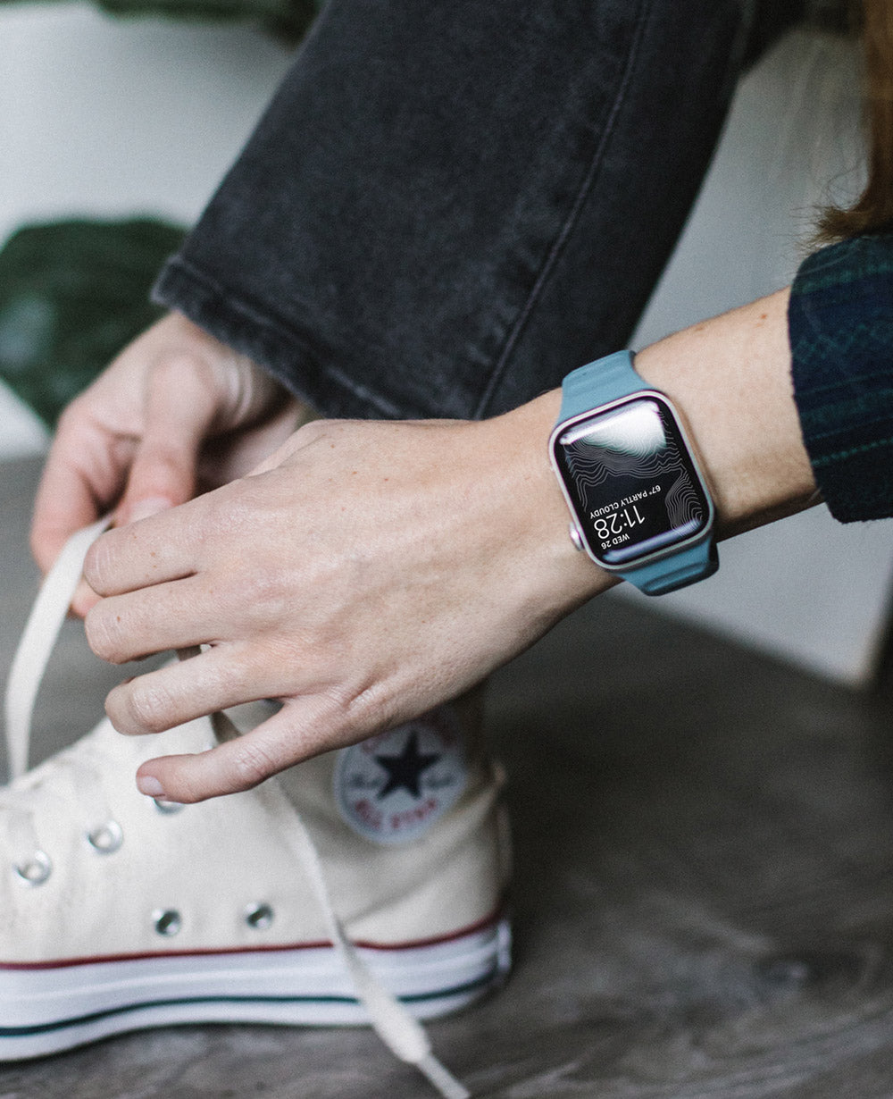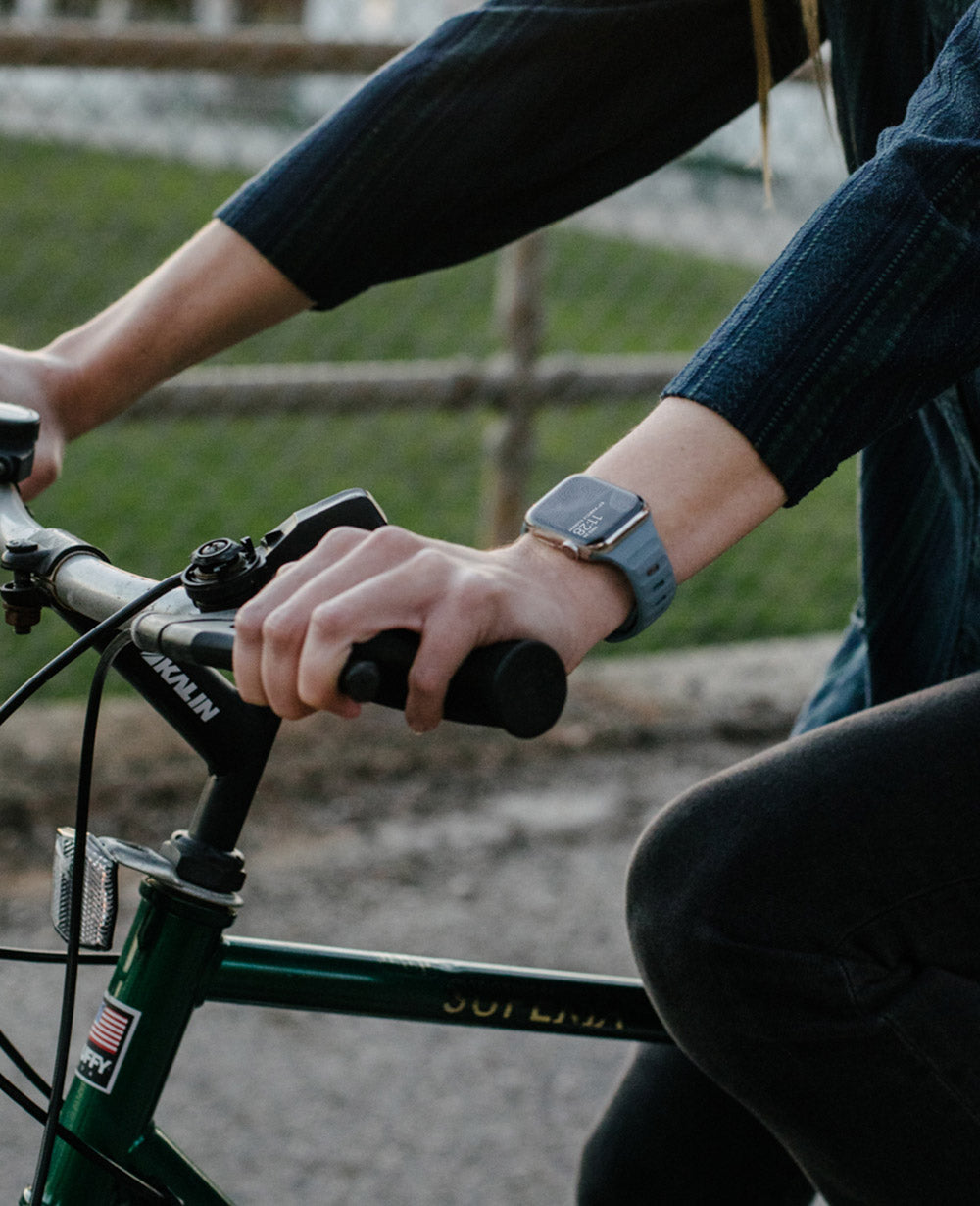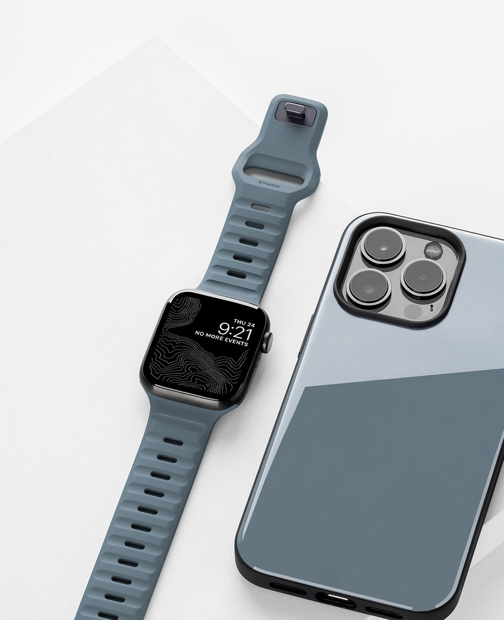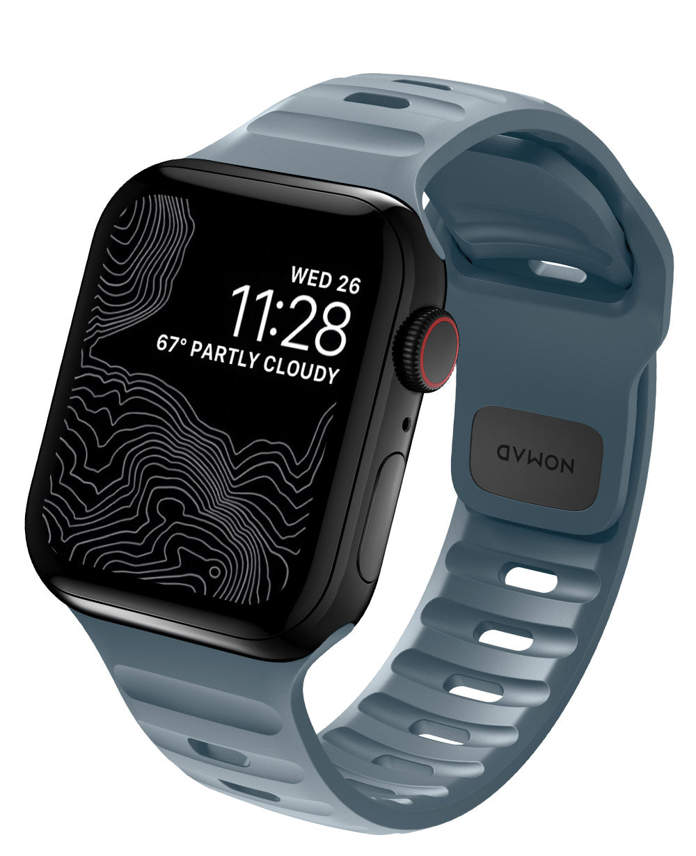 Sport Bandは、Apple Watchにモダンでアクティブな印象を与え、オフィスからアウトドアまでシームレスに馴染むデザインです。軽量で通気性に優れた設計により、一日中快適に着用でき、ロープロファイルのピン&タック機構がしっかりとした装着感を提供します。