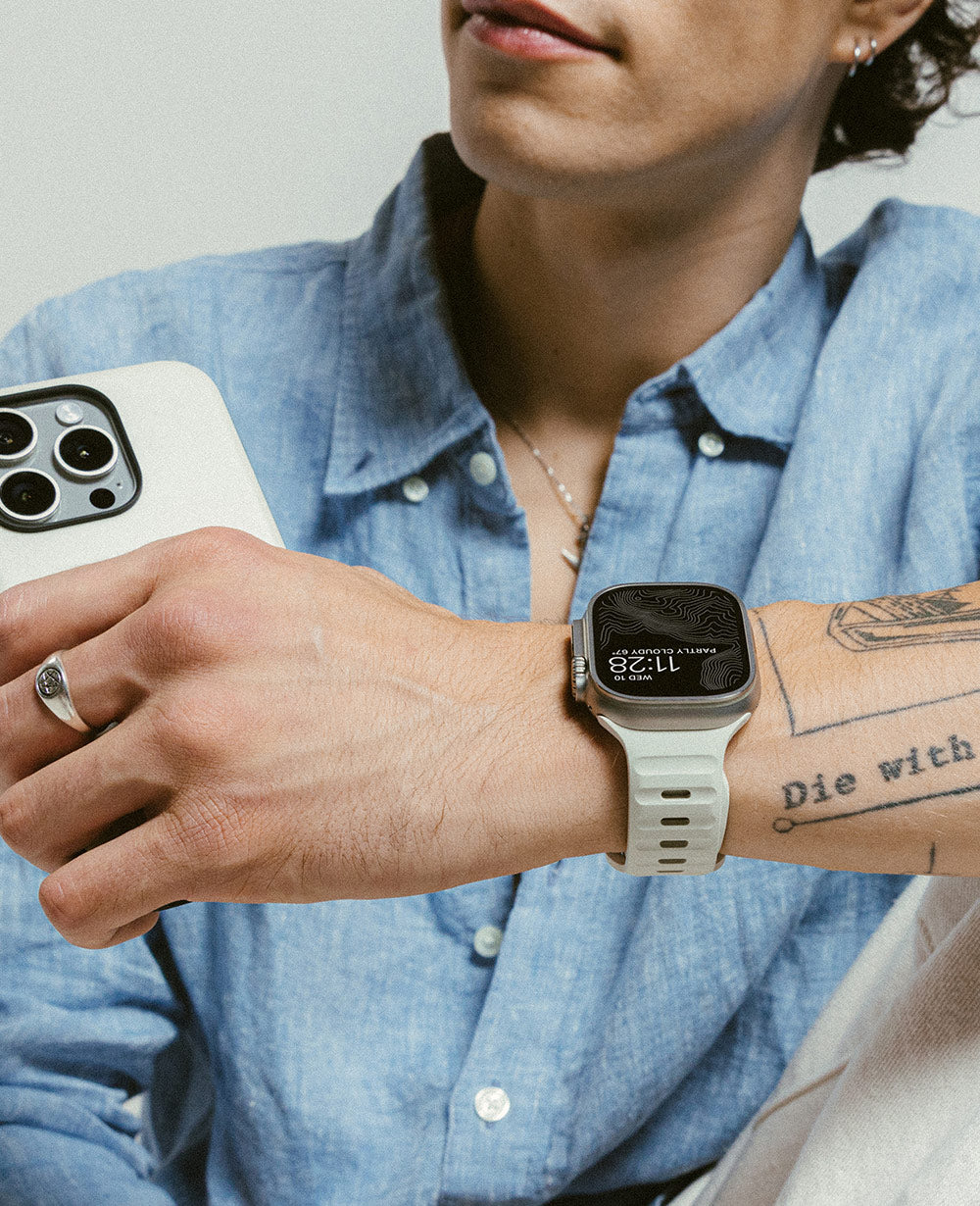 バンドのスポーティな美しさと細部へのこだわりが融合し、洗練された控えめなデザインを生み出します。FKM素材には繊細なマイクロテクスチャが施されており、滑らかで雲のような心地よい触感を提供します。